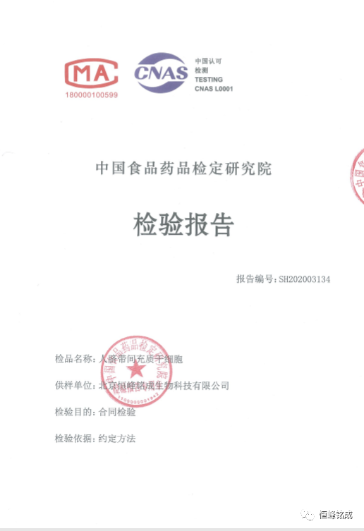 6月,恒峰铭成干细胞产品“人脐带间充质干细胞(hMSCs)”通过中国食品药品检定研究院审核,正式获得中检院颁发的《检验报告》